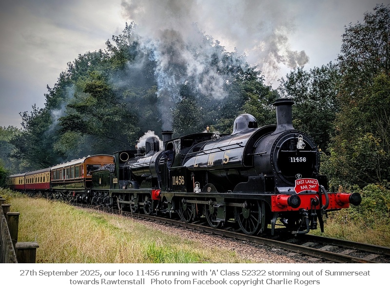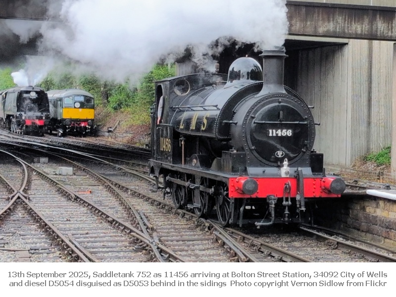 Now in June 2025 and 14th was to feature Saddletank 752 as 11456 double-heading a steam service on the East Lancashire Railway on one of their ‘Lancashire & Yorkshire Running Days’ to operate on selected days in 2025 (full details click here) but unfortunately part of one of the big ends of 11456 became detached before Summerseat was reached, the image from Harry Cain below shows the crew debating what action to take – work gently to Ramsbottom, detach 11456 and work it carefully back to Bury. There is a video on our ‘Video Online’ page on which the motion problem can be heard.